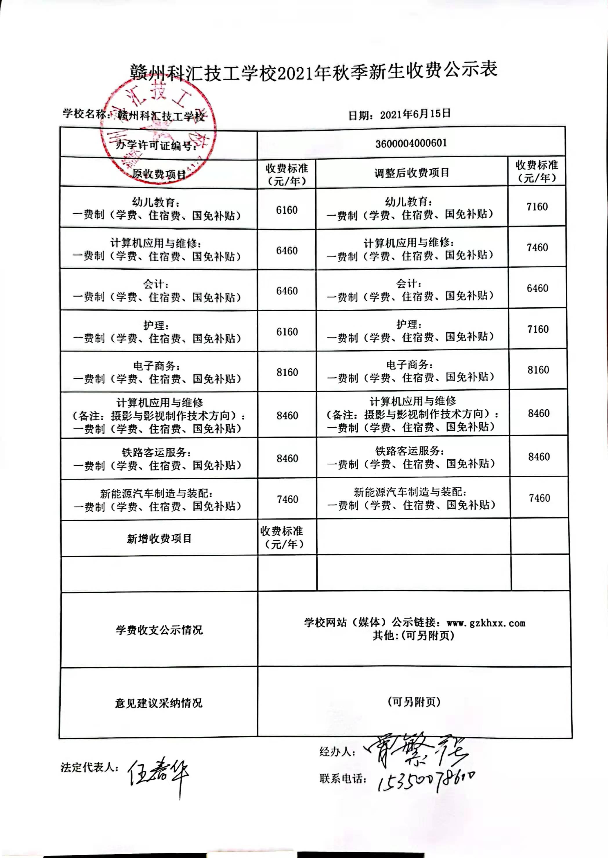 贛州科匯技工學(xué)校2021年秋季新生收費公示表