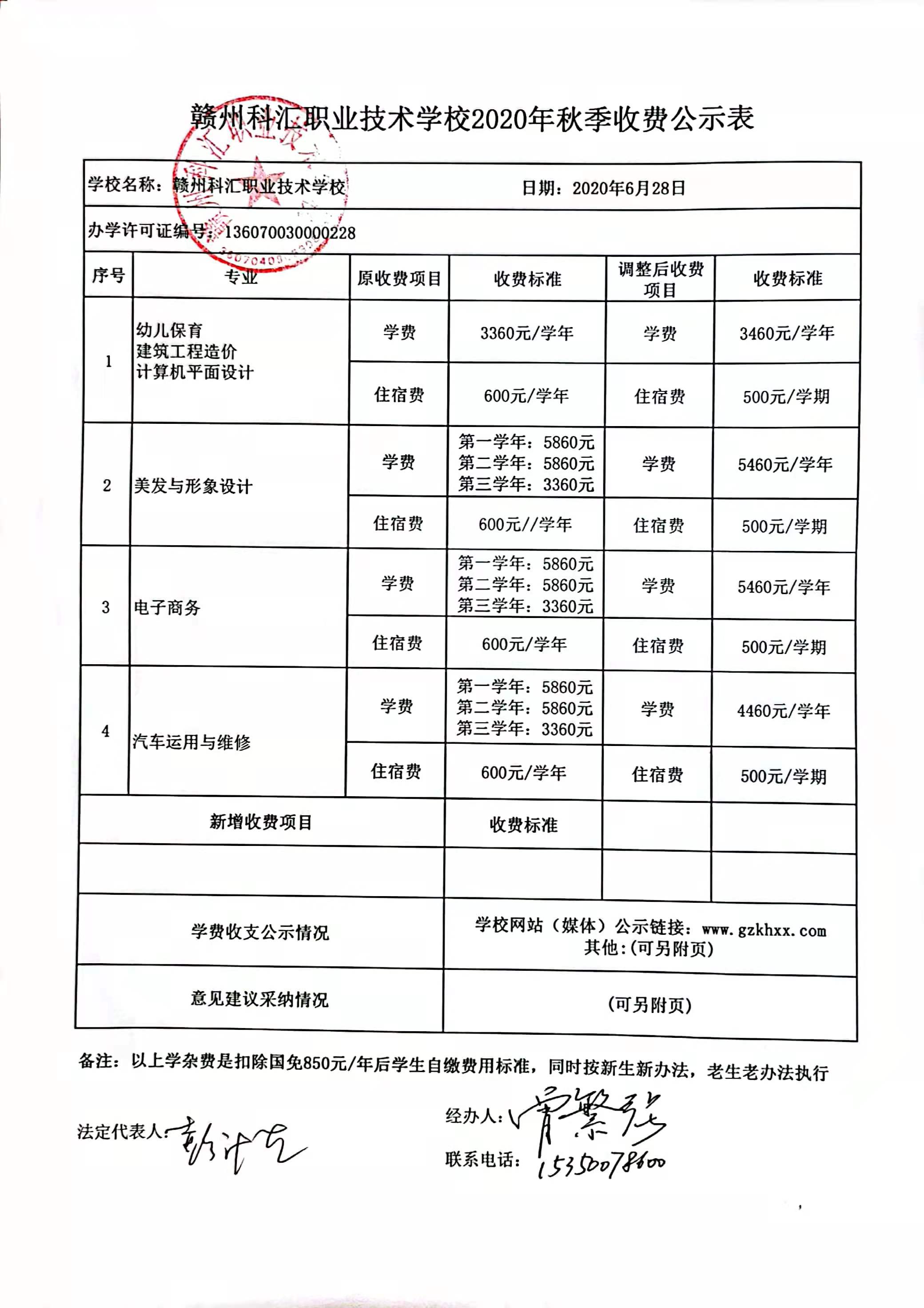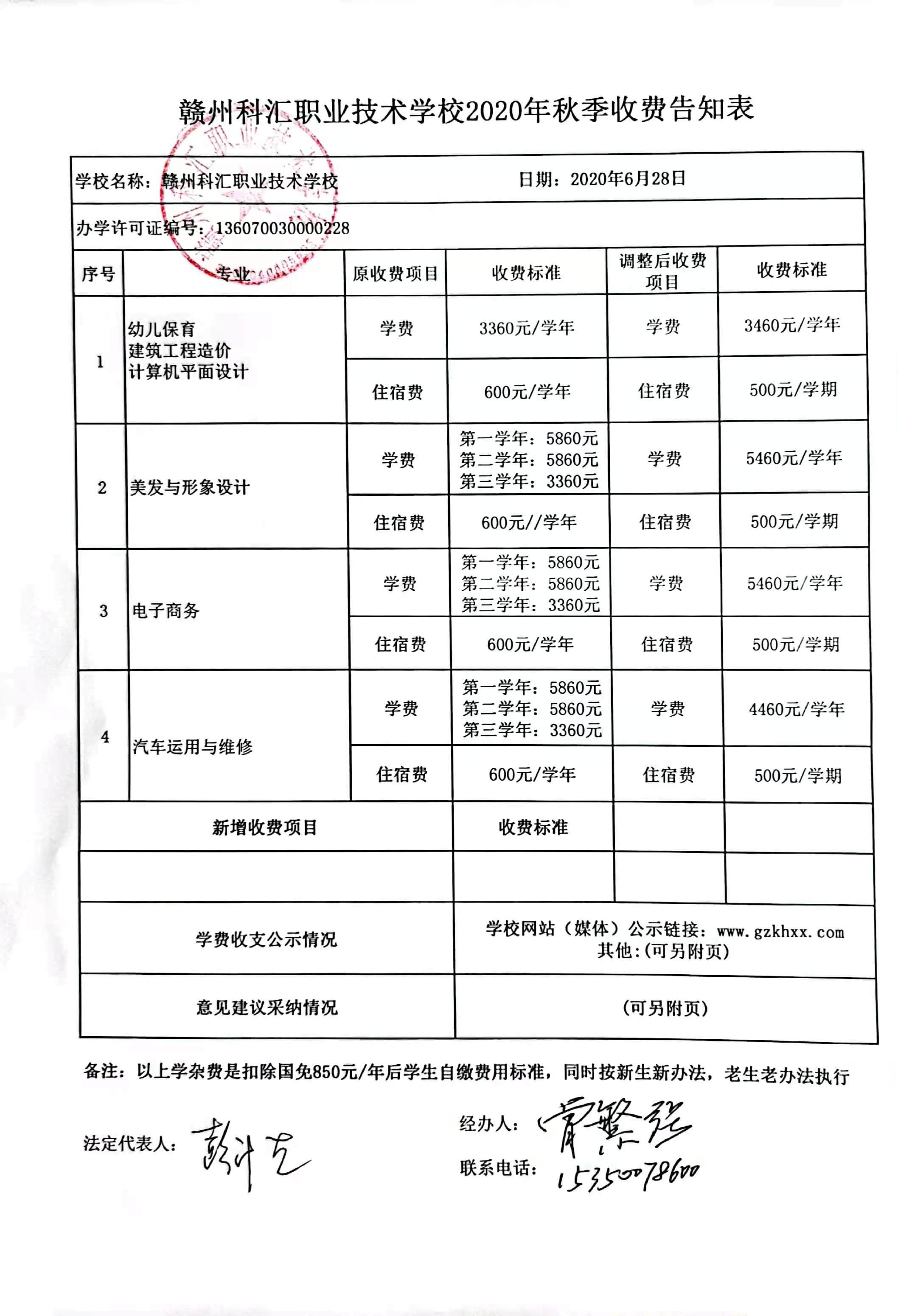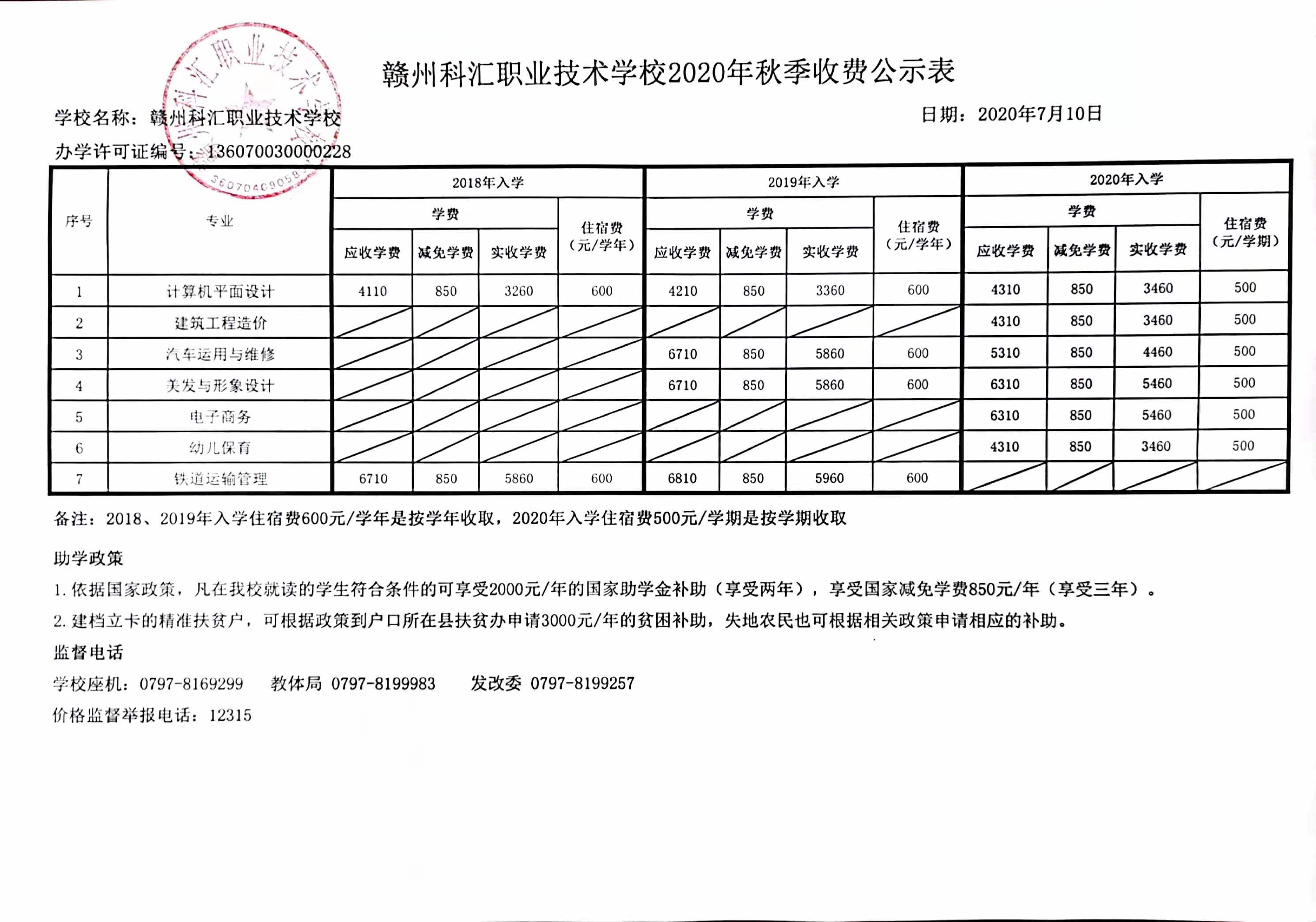 贛州科匯職業(yè)技術(shù)學(xué)校2020年秋季收費公示表1