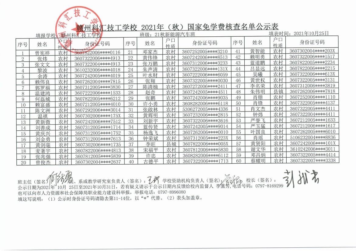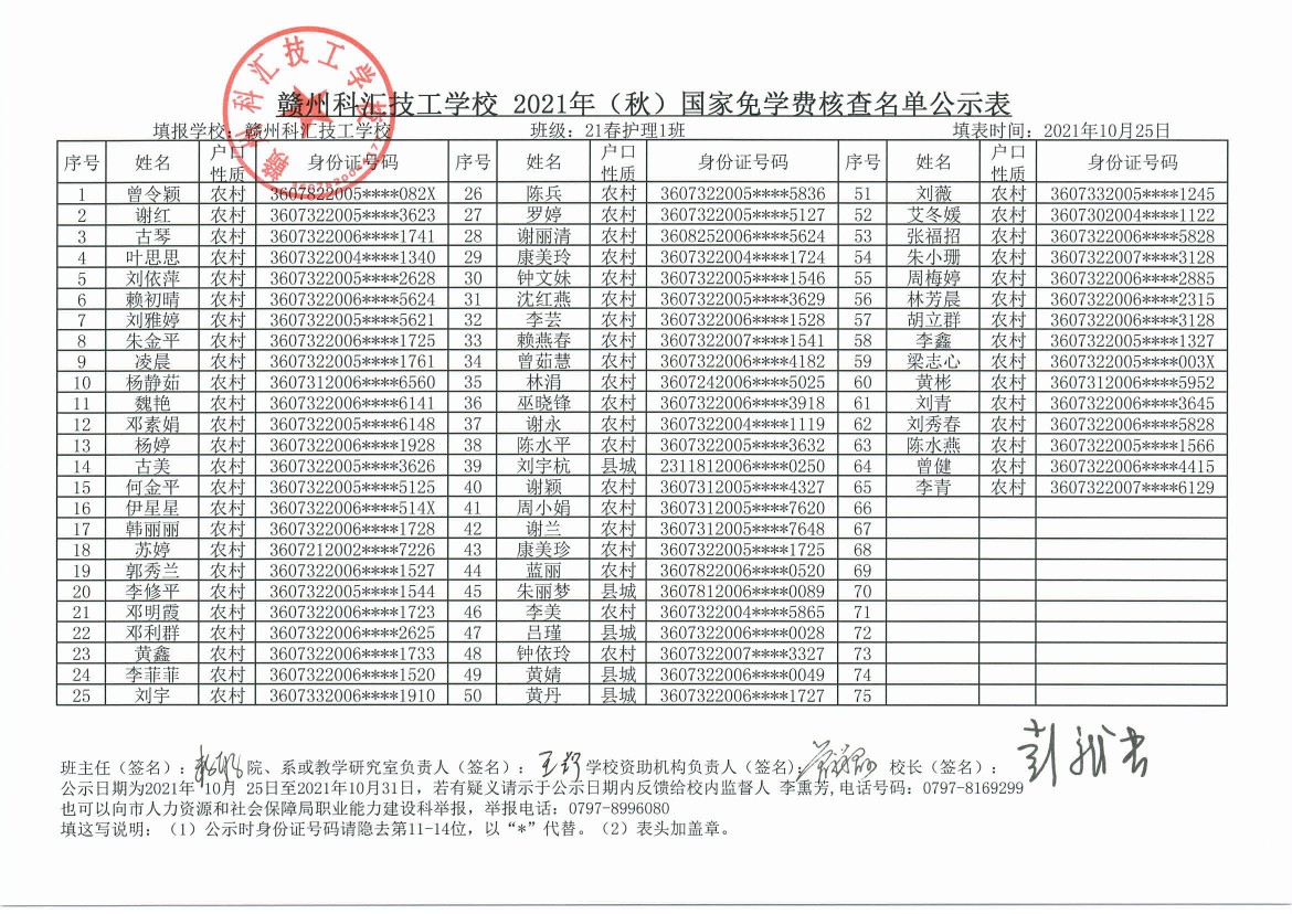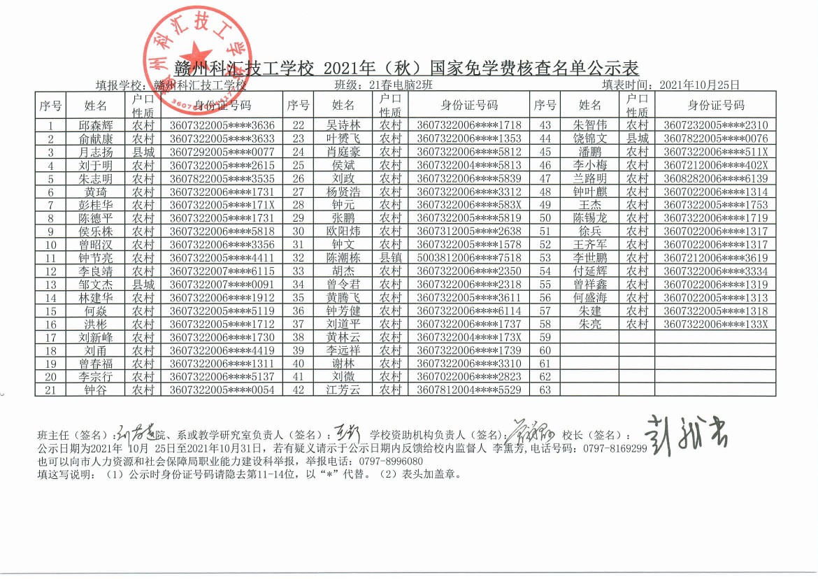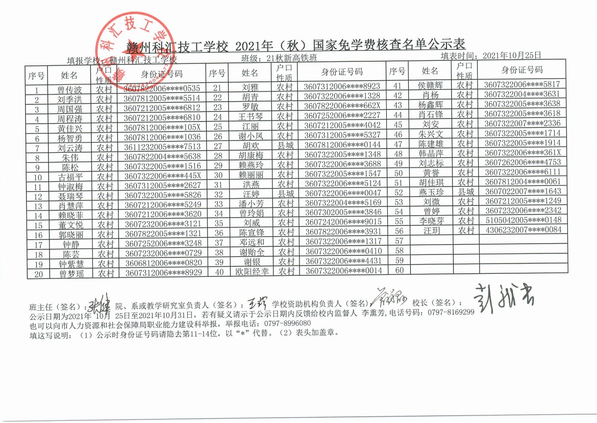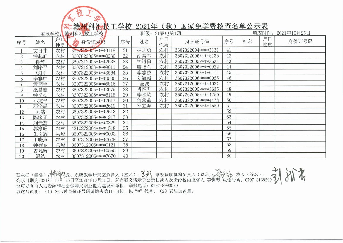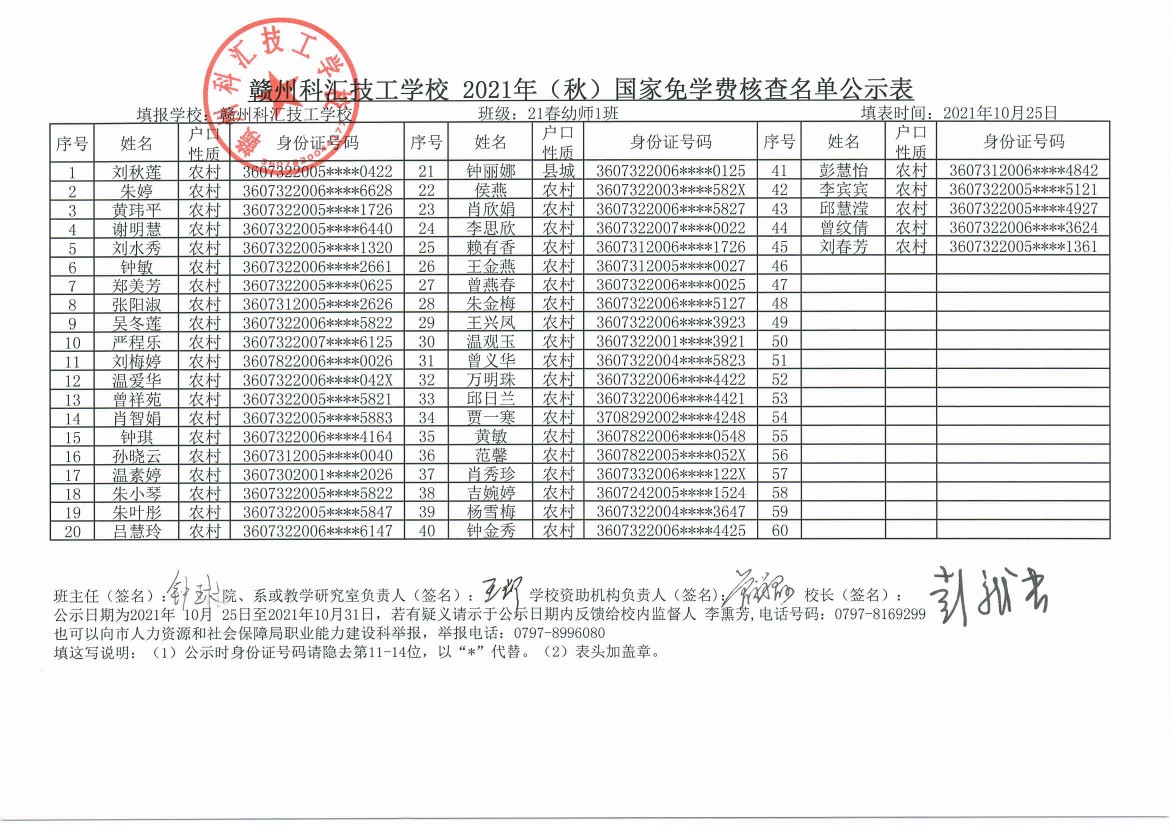 贛州科匯技工學(xué)校 2021年(秋)國家免學(xué)費核查名單公示表