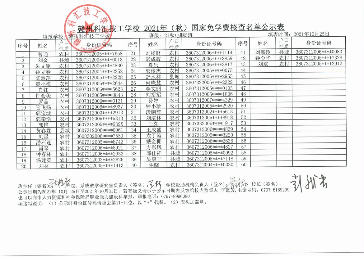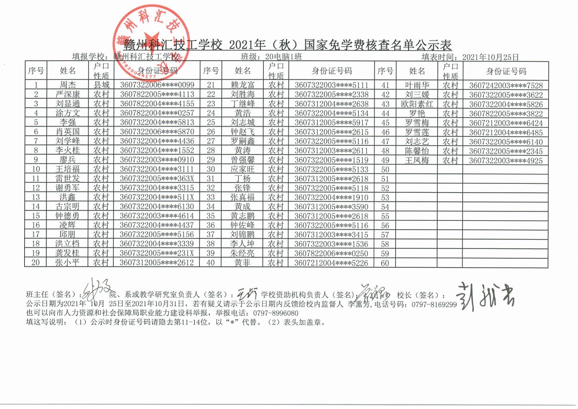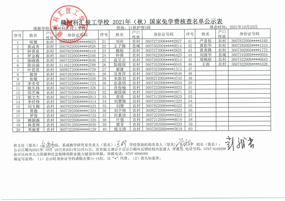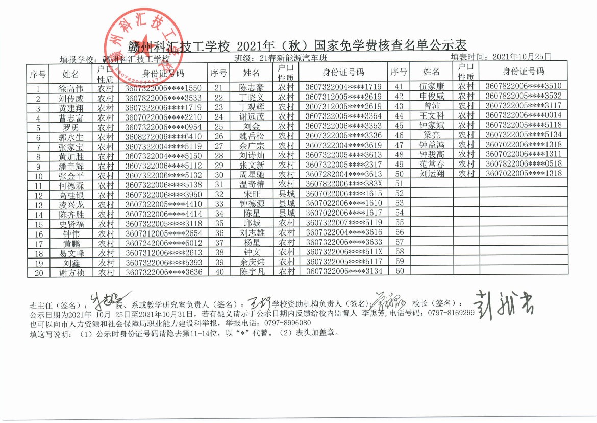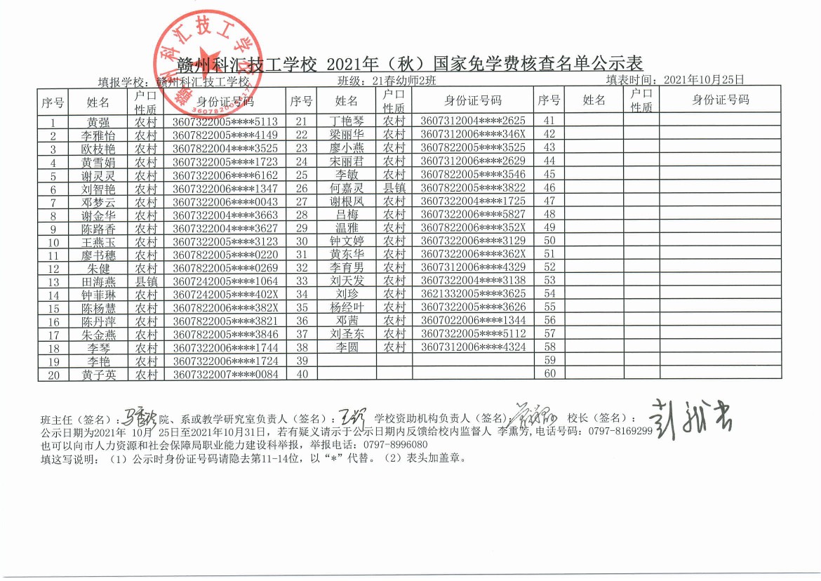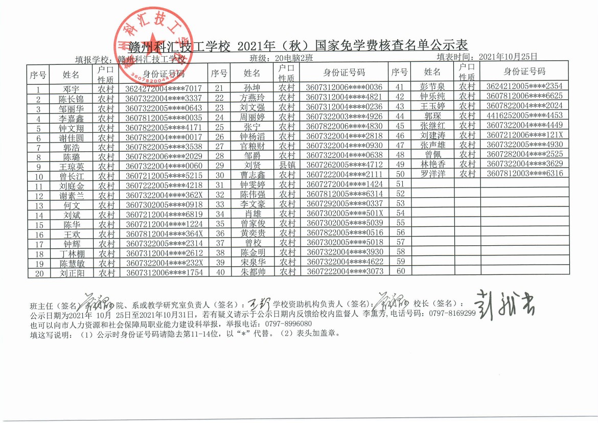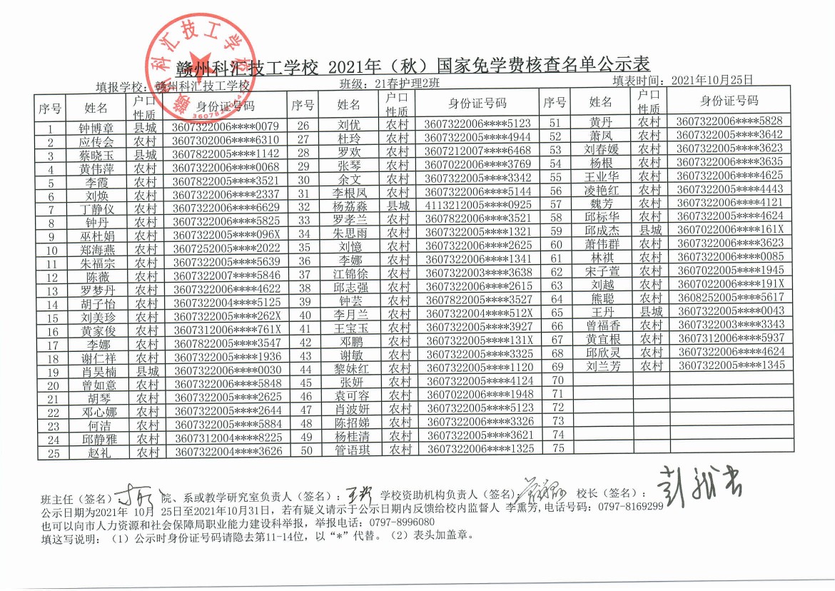 贛州科匯技工學(xué)校 2021年(秋)國家免學(xué)費核查名單公示表