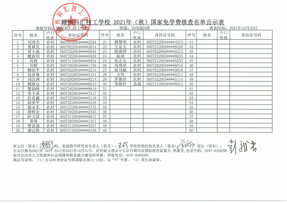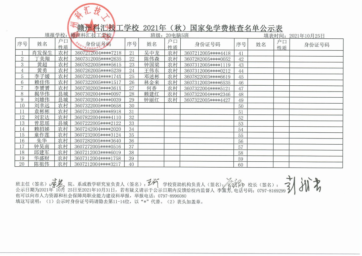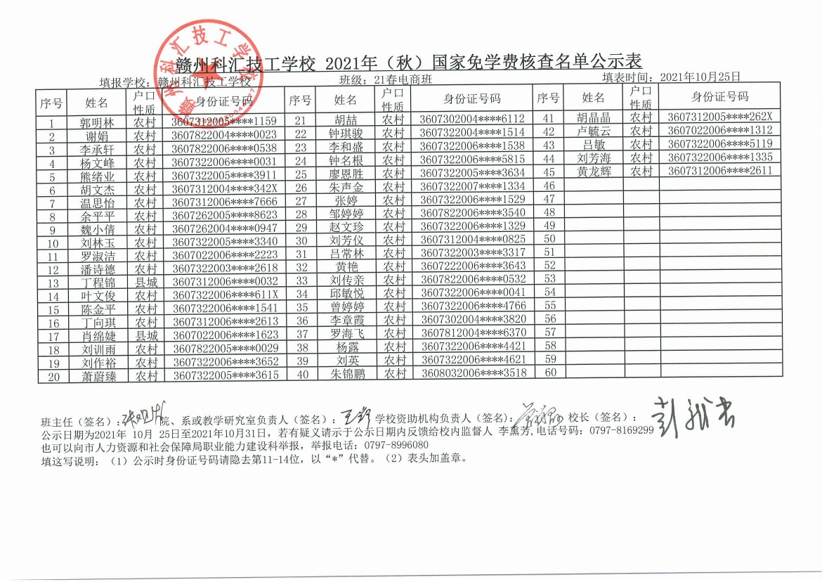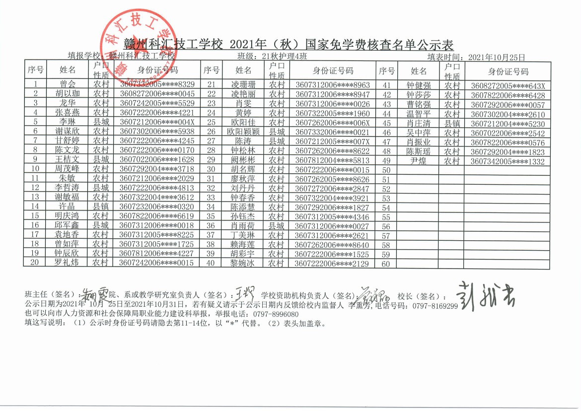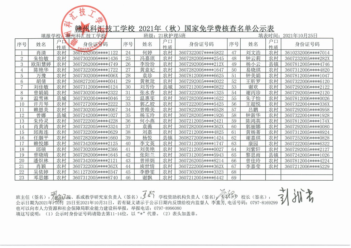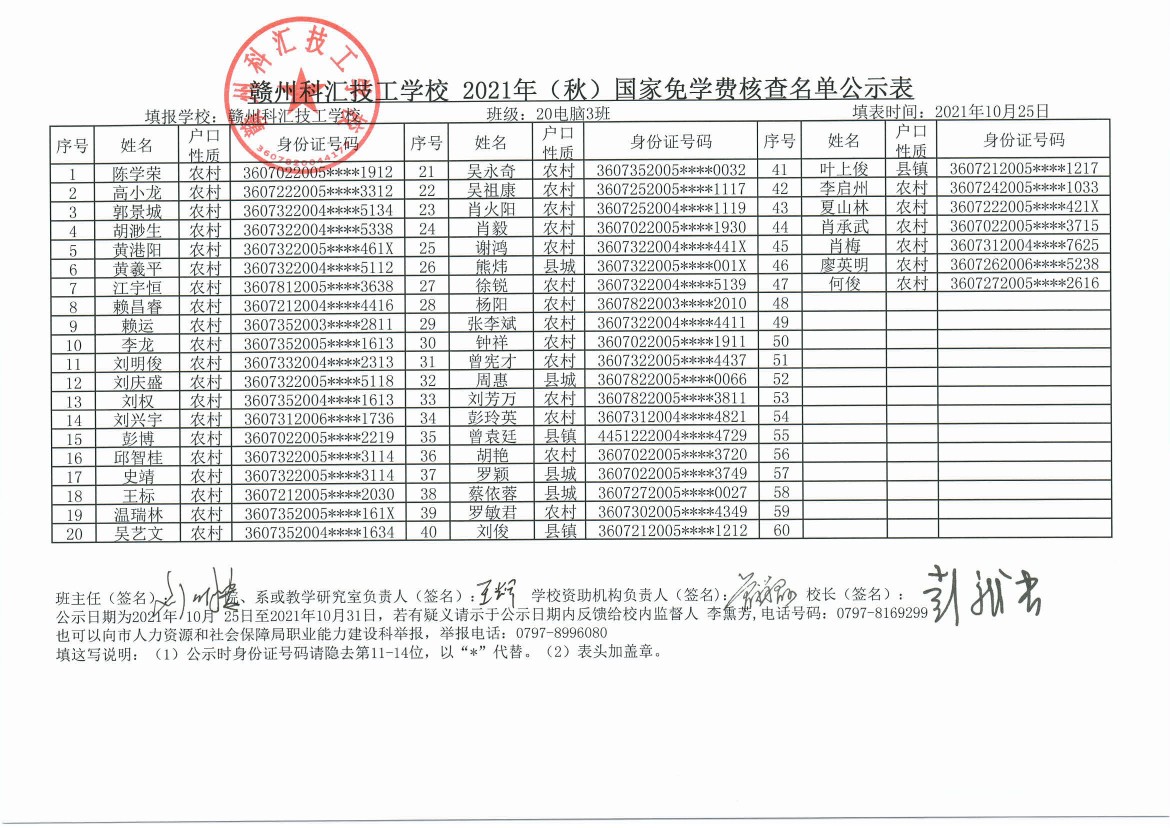 贛州科匯技工學(xué)校 2021年(秋)國家免學(xué)費核查名單公示表