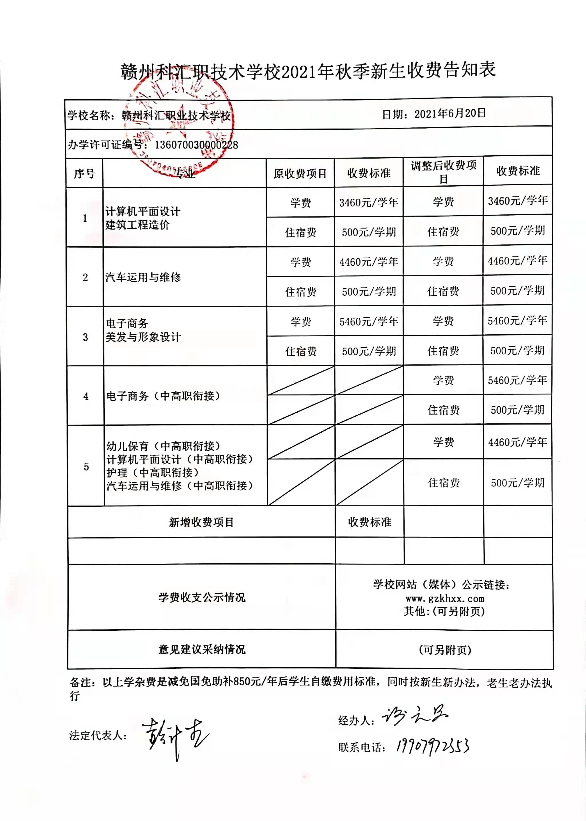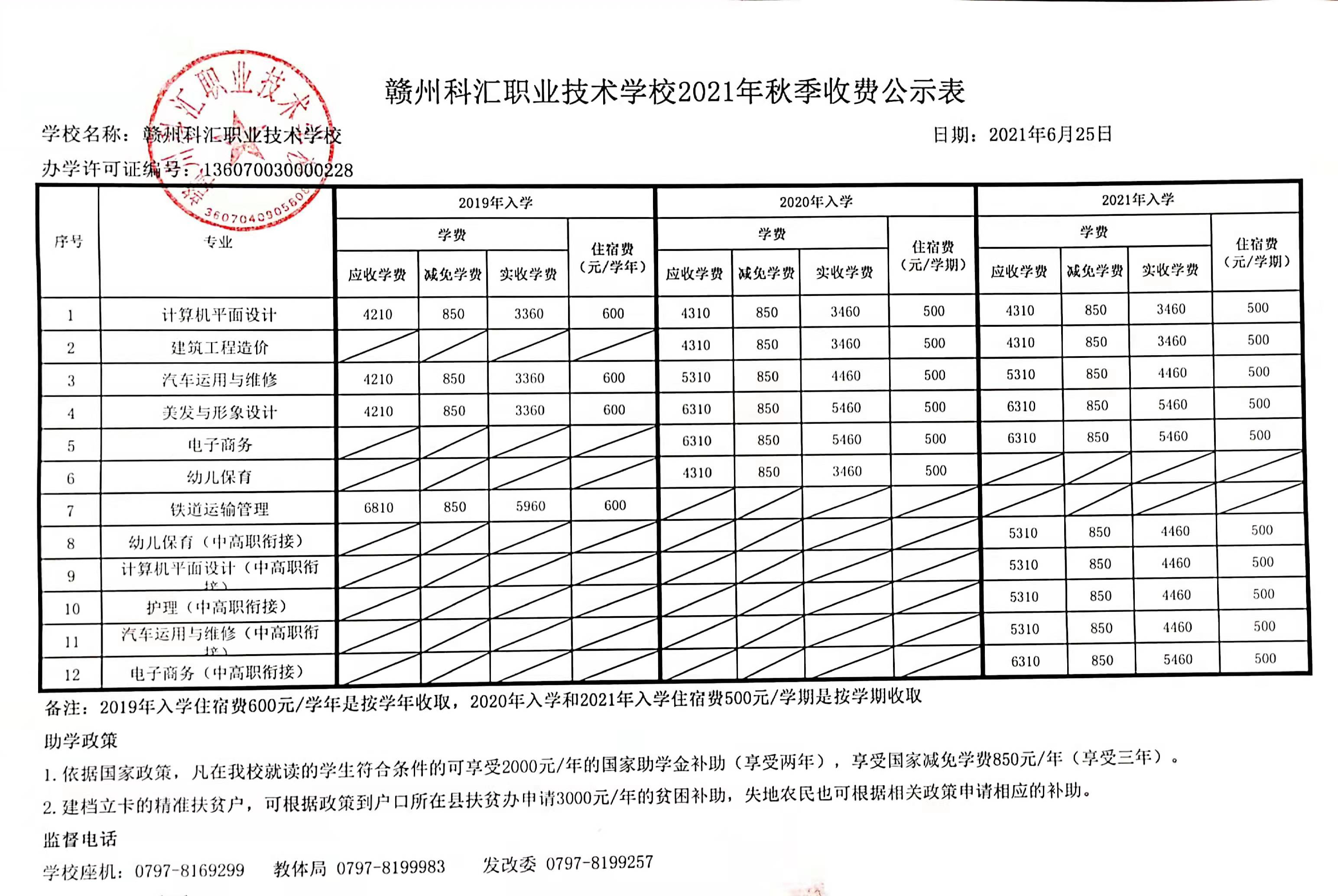 贛州科匯技工學(xué)校2021年秋季收費(fèi)告知表